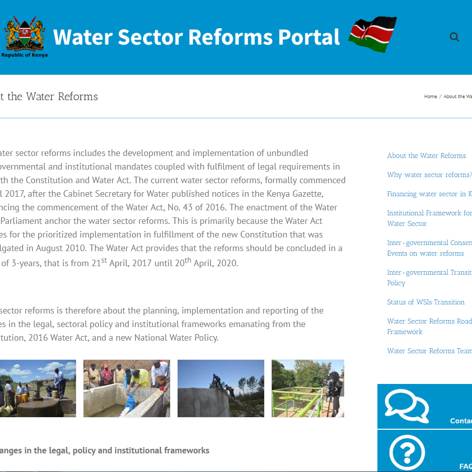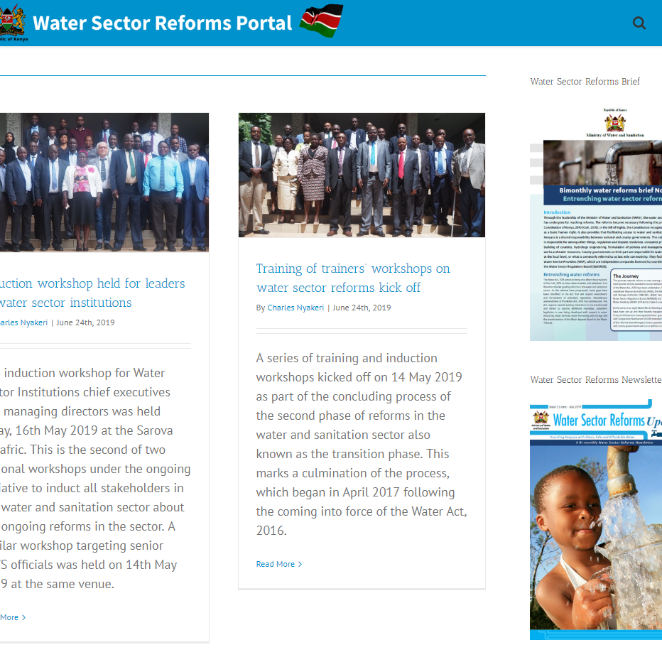 El Ministerio de Agua y Saneamiento de Kenia y la Asociación Internacional de Fomento (IDA) han impulsado el desarrollo del portal de Reformas del Sector del Agua con el objetivo de mejorar la comunicación sobre dicha reforma y fortalecer la capacidad del personal del sector hídrico.